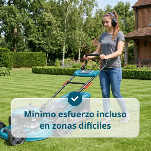 • Mínimo esfuerzo incluso en superficies grandes y complejas. La función de tracción en las ruedas del cortacésped garantiza un movimiento uniforme hacia adelante sin necesidad de empujarlo manualmente, reduciendo significativamente la carga en brazos y espalda y facilitando el corte durante trabajos prolongados en grandes superficies y pendientes.