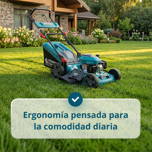 • Comodidad, fiabilidad y ergonomía bien pensada en cada detalle. La forma innovadora de la plataforma de corte para mejorar la recogida de la hierba cortada y proteger la correa de transmisión, el estrangulador de aire automático, las grandes ruedas engomadas con dibujo profundo, las cómodas palancas de control, el plegado sin herramientas y el almacenamiento compacto garantizan un trabajo cómodo y un uso práctico a diario.