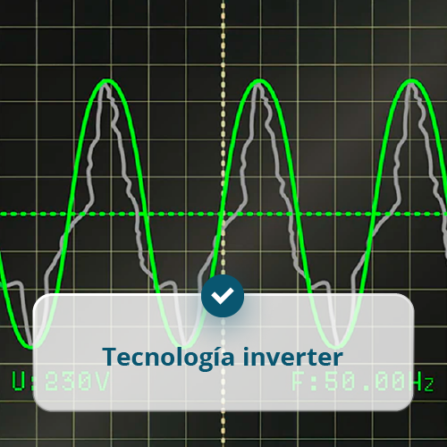 • Tecnología inverter de alta potencia: control electrónico con microprocesador que garantiza un volumen de salida estable de 230V 50Hz con onda sinusoidal pura, adecuada para equipos electrónicos sensibles.