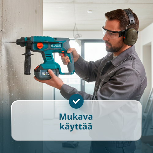 • Korkea teho ja monipuolisuus – 60 Nm porakone, jossa on 2 toimintatilaa: poraus ja ruuvaus, sekä 23 vääntömomentin asetusta; kulmahiomakone, jossa säädettävä nopeus 2500–10 000 rpm; ja poravasara, jossa 2 J iskuenergiaa ja 4 tilaa: poraus, iskuporaus, pyörivä vasara ja pelkkä vasara – kaikki suoriutuvat monenlaisista tehtävistä.
