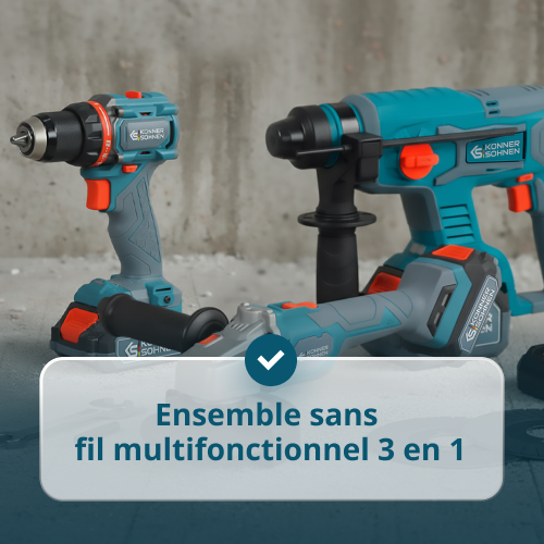 • Ensemble multifonction sans fil 3-en-1 dans un sac pratique – trois outils en un seul ensemble : perceuse, meuleuse d'angle, perforateur avec 2 batteries et un chargeur rapide dans un sac pratique pour diverses tâches ménagères.