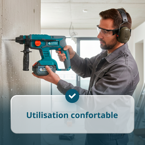 • Haute puissance et polyvalence – perceuse de 60 Nm avec 2 modes de fonctionnement : perçage et vissage, et 23 positions de couple, meuleuse d'angle avec réglage de vitesse de 2500 à 10000 tr/min et perforateur avec une puissance de frappe de 2 J et 4 modes de travail : perçage, perçage avec percussion, percussion avec rotation et percussion, qui peuvent gérer diverses tâches.