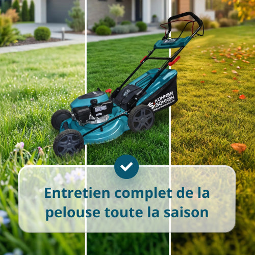 • Entretien complet de la pelouse tout au long de la saison. 7 fonctions en un seul outil (ramassage de l’herbe, mulching, éjection latérale ou arrière, ramassage des feuilles, auto-nettoyage à l’eau et entraînement autotracté) permettent d’effectuer tous les travaux saisonniers sans équipement supplémentaire.