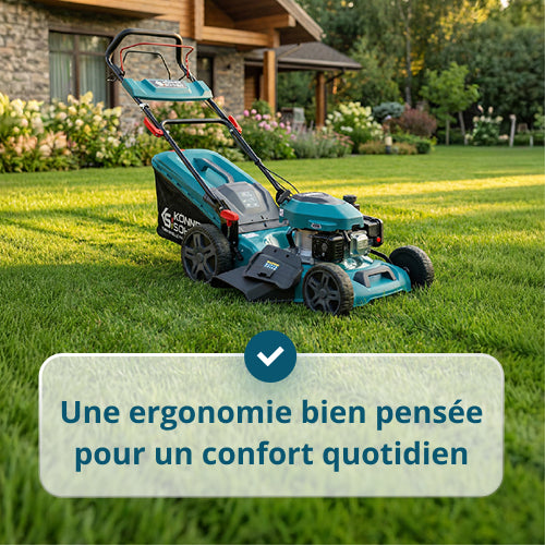 • Confort, fiabilité et ergonomie bien pensée dans chaque détail. La forme innovante du carter de coupe pour une meilleure collecte de l’herbe coupée et la protection de la courroie d’entraînement, le volet d’air automatique, les grandes roues caoutchoutées à profil profond, les leviers de commande pratiques, le pliage sans outils et le rangement compact garantissent un travail confortable et une utilisation pratique au quotidien.