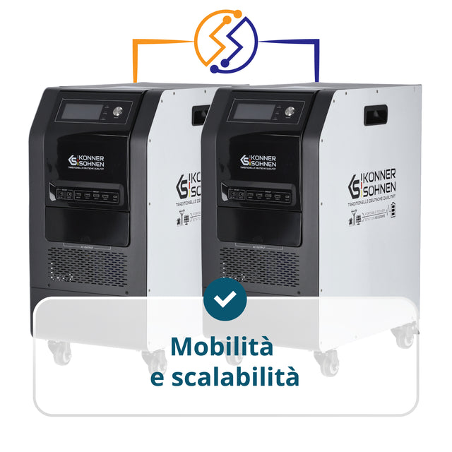 Uscita 48V DC per generatore o batteria, Inverter con onda sinusoidale pura, LiFePO₄ 5,12 kWh, Controller MPPT, UPS < 10 ms, Supporto Tandem Power, Ricarica rapida fino all’80% in 1 ora, Protezione da sovraccarico e surriscaldamento, Display LCD con monitoraggio dei parametri, Ruote e maniglie per il trasporto |