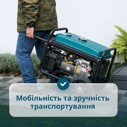• Мобільність і зручність транспортування — колеса та ручки дозволяють легко переміщувати генератор без фізичного навантаження.